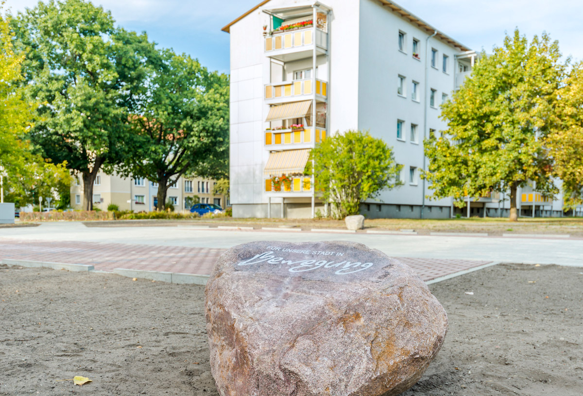 Auf dem Grundstück des zurückgebauten Hauses B.-Brecht-Str. 1 – 5 haben wir für unsere Mieterinnen und Mieter insgesamt 31 PKW- Stellplätze geschaffen, von denen zwei behindertengerecht sind. Für die Sicherheit ist auch gesorgt: Eine Kettenanlage verhindert die Einfahrt für Unbefugte. Und das ist noch nicht alles. Bei der Gestaltung wollten wir einmal etwas ganz anderes tun und sind somit von den bisherigen Verfahrensweisen etwas abgewichen. Ein optisches Highlight sind die Findlinge aus dem Tagebau Nochten, welche rund um die Parkfläche einen neuen Platz gefunden haben. Aufwendig gestaltet ist die Zufahrt – hier ist das Firmenlogo unserer Wohnungsgesellschaft mbH Hoyerswerda und der Slogan „Für unsere Stadt in Bewegung” auf den Findlingen sichtbar. “Wir wollen neben einer gezielten Werbung für unser Unternehmen ebenfalls darauf hinweisen, dass diese Stellflächen zu unserer Wohnungsgesellschaft mbH Hoyerswerda gehören”, sagt Geschäftsführer Steffen Markgraf.
